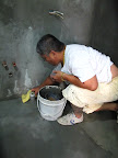 以對目前兩間廁所的防水施作,Thoroseal fx100的乾燥、乾固的時間,確實必需要以氣候溫度的狀況來作判斷決擇。比如偶是先從客浴室的牆壁,然後是客浴的地板,接著是女兒房牆壁,然後接著是地坪。因為等到作完第二間防水時,就可以回頭到第一間廁所施作了,而不致於耽誤時間。只是Thoroseal fx100乾固狀況確實得憑借施作經驗去決擇。