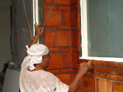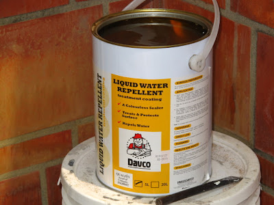然而針對儲藏室外牆貼附的壁磚是用吸水率較高的陶磚且溝縫填縫土風化,故對外牆塗布撥水劑三道,使其陶磚不會因此吸附過多的雨水而滲進儲物間。