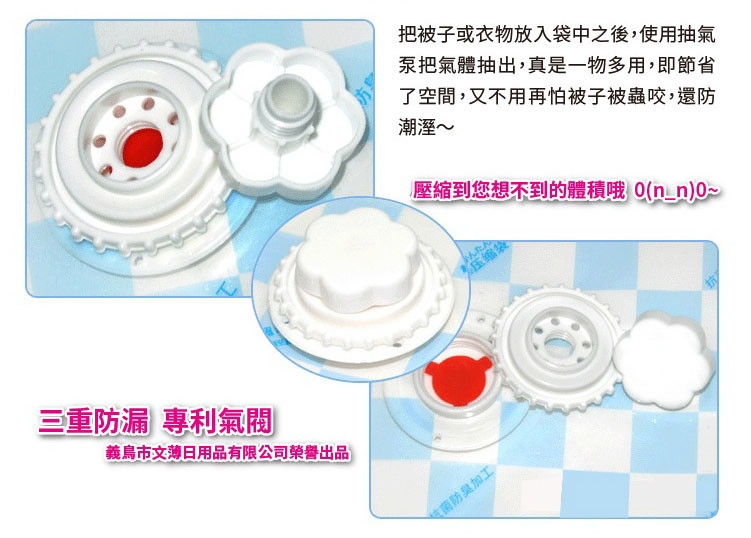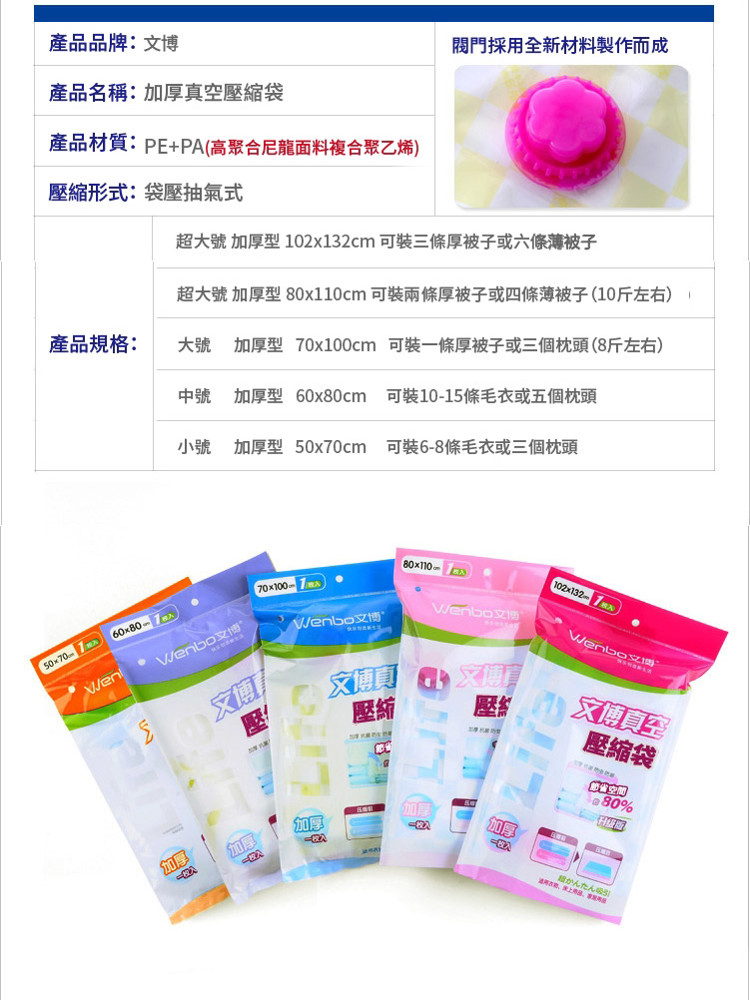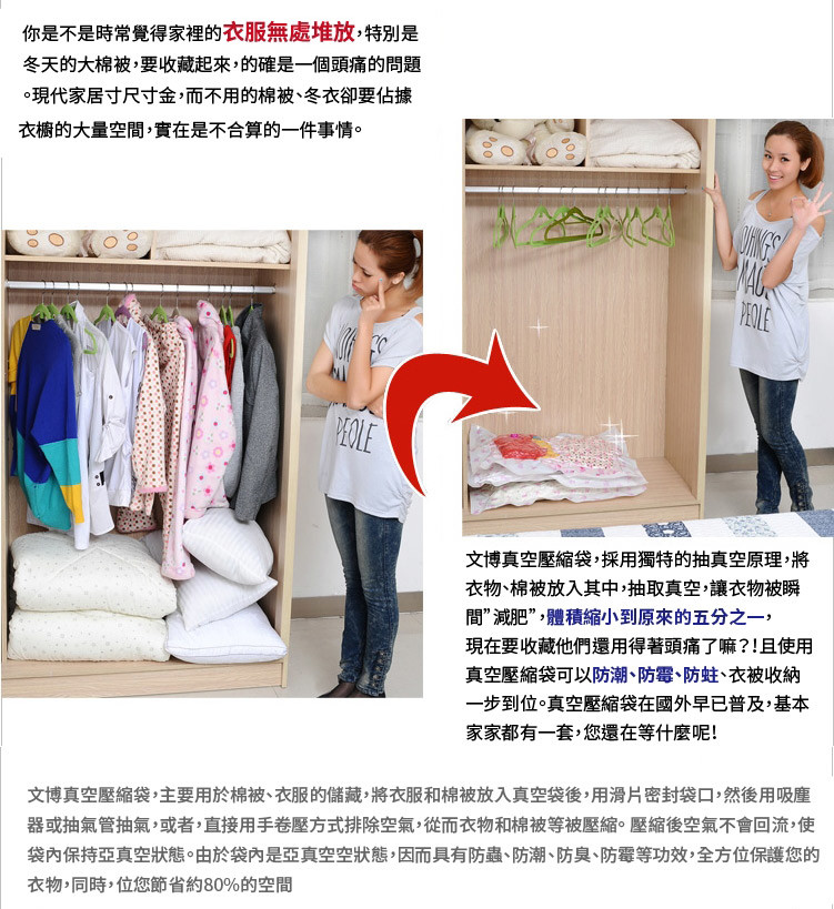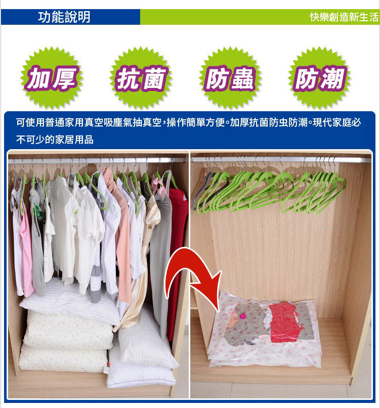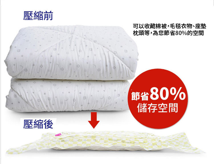 用途:我們二胎利率最低的日常生活中,塞得滿滿的被子衣服櫃 總讓人覺得不知所措。有了各類大小的“真空壓縮袋”,問題就解決了,它不但能把你的衣櫃解放出來,它獨特的密封設計還可以達到防潮、防蟲咬、清潔保存的效果。