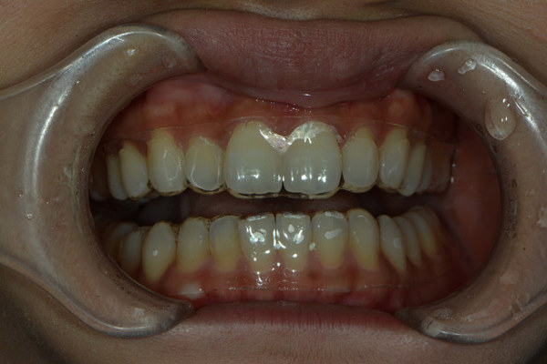 這邊也先來看一張對照組,是我拿家裡沒用過的美白牙托到權泓牙醫給黃泓傑醫師諮詢用的,他建議我配戴後拍照比較,可以很明顯地看出沒有量身打造的美白牙托有多不適合!