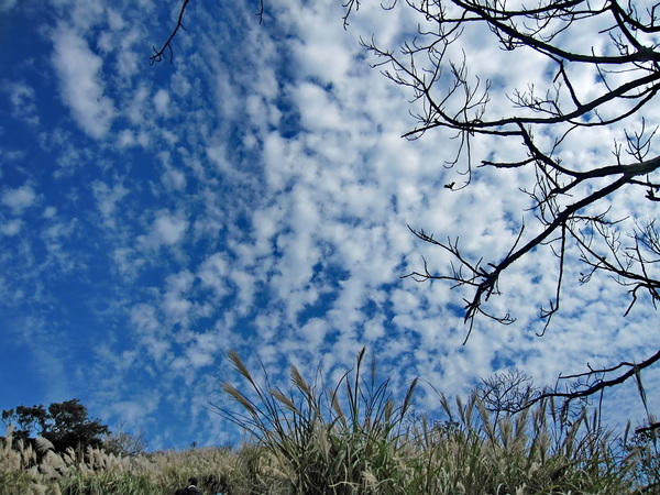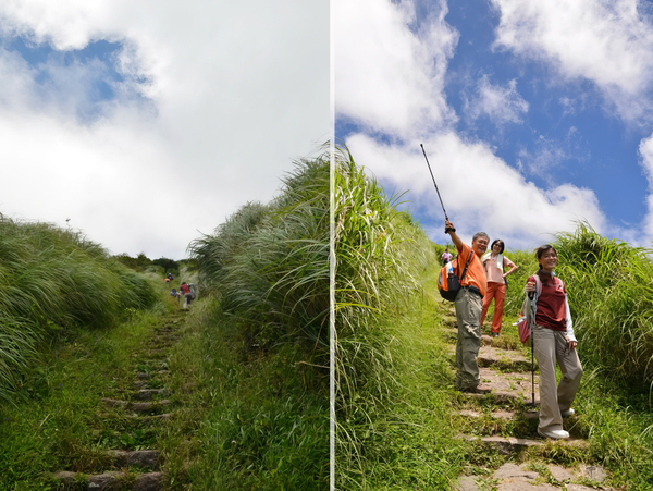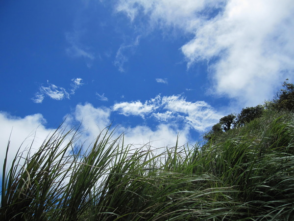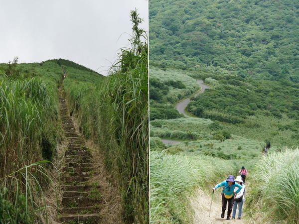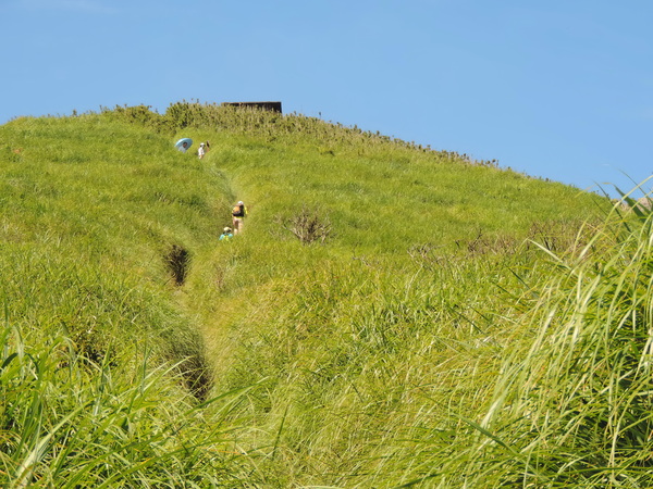 步道盡頭,穿出箭竹林,經過軍事設施閘門,便踏上山頂柏油路。此刻彷彿行走於芒花之海。一整片山坡的金黃在風中搖曳,群峰環抱,這裡不愧是拍攝夕陽、雲海與芒草的聖地。