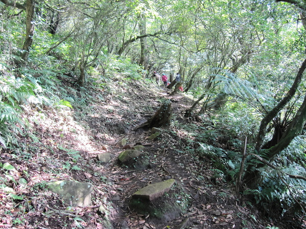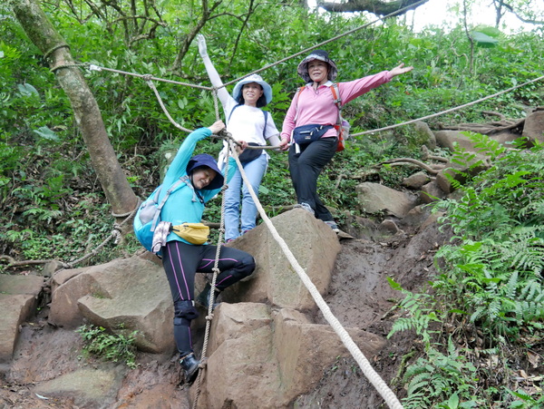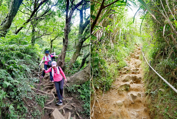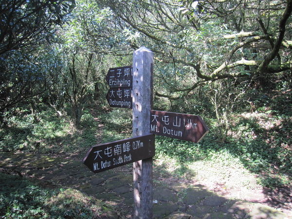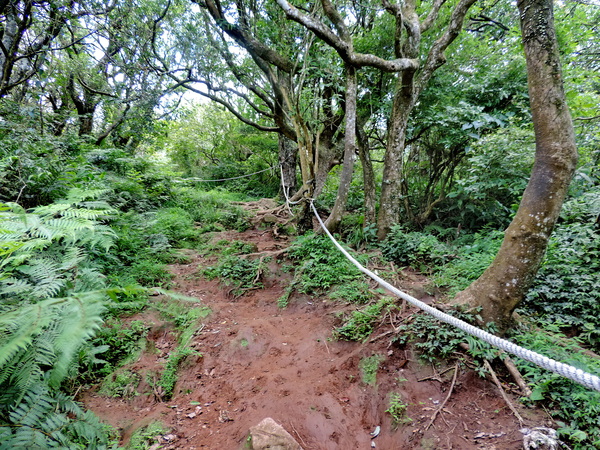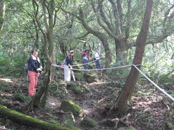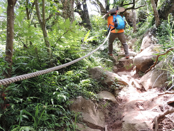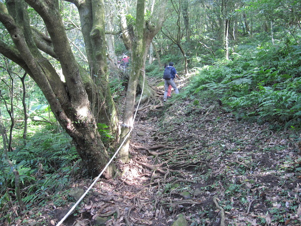 大屯坪涼亭前的岔路,左轉便向南峰而去。途中遇見的山友說,他們總以此處作為攀登大山的暖身。地圖上等高線看似溫和,親臨方知不同,這裡沒有主峰完善的石階,只有原始土石與綿長拉繩。