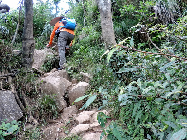 穿過車道兩個髮夾彎,自路邊隱密處鑽入箭竹林,便接上主峰步道。抬頭望去,山頂遙遙在前,目標明確,剩下的便是與自己的對話,將漫長石階,一階一階,走成修行。