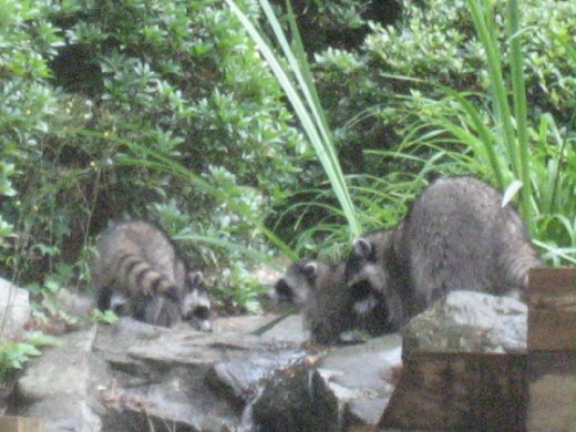 q妮說--- 浣熊除了會翻垃圾. 吃池中的魚. 與人相遇有時會攻擊人做自我防禦 .牠的抓子易帶有病菌被抓傷怕被傳染.....比較麻煩的是當牠懷孕要生小浣熊時會入屋頂做窩.母浣熊外出覓食小浣熊留在屋頂(應該說是瓦內我們的頭頂上)造成屋瓦某處的破壞另外屋內的排泄以及玩耍的"熱鬧"........ ps:聽說請專人抓走一隻100加幣唷!(數年前舊行情)