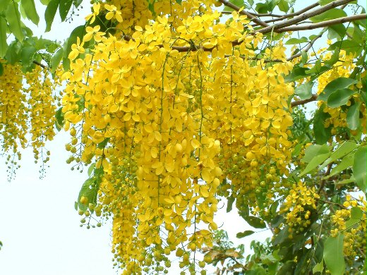 阿勃勒,原產印度、錫蘭,五到七月開花,花序下垂長約30公分,先開花而後長葉,花瓣5,離生,大小略等,長約2.5公分;雄蕊10枚,花絲黃色,彎成勾狀,其中有三枚特長、四枚中等而另三枚較短為不孕性。花落後結出長棍狀圓莢果,不開裂,長30-60公分, 直徑 2-3 公分,熟果黑褐色,內具粘性,有異味。