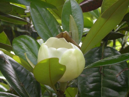 在台北市羅斯福路與汀洲路交口的耕莘文教院後院 有兩株高大喬木 春末的一個下午走過院牆外的巷子 偶一抬眼 咦??? 密密的葉間怎麼有好幾朵像碗那麼大的白花 太高看不清楚 隔天帶著望遠鏡再去看 好漂亮的白花 好漂亮的大白花 自那時起我習慣性的注意起樹梢 期望有新發現 以後也在幾處見過它 它太高了 親近不得 有人告訴我它叫<木蓮>