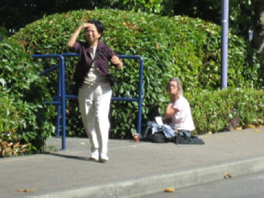 待採購完畢出了Mall已11點多 見那女士還坐在那 經過她旁邊見她已是滿頭汗 再看那紙杯 裡面沒飲料 有幾枚錢幣 噢~~ 她是乞者