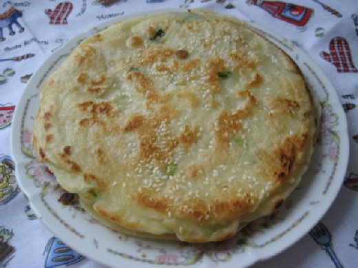 弄成一小塊一小塊的,然後桿成一個大圓圈,煎的時候再放蛋.就是葱油蛋餅囉.