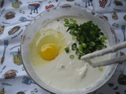 取適量麵粉放入容器 邊拌邊慢慢加入冷水和成稀糊狀(和麵時加1/2茶匙鹽) 提起筷子時麵糊會滴落 再加入蔥花和蛋和勻