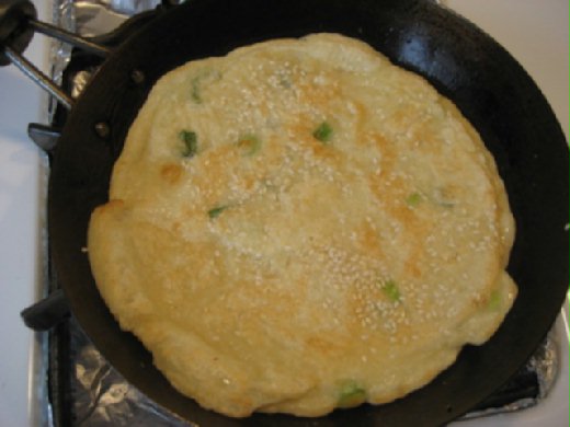 平底鍋內放少許油 讓油均勻在鍋面上 到入適量麵糊 用鏟子將麵糊展鋪在鍋面 灑些芝麻(也可將芝麻拌在麵糊中) 用中小火煎至略焦黃 翻面續煎至略黃即可
