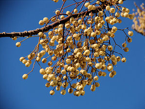 花後結果的苦楝 掛滿一樹橢圓形的小核果 由嫩綠開始 金黃最盛 俗稱金鈴子