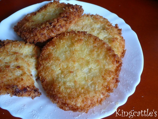 每一片馬鈴薯泥先均勻沾裹蛋液及麵包粉後,入鍋油炸。因馬鈴薯泥原本就已蒸熟了,所以入鍋後,只要外觀均勻上色、略微澎漲起來後,即可起鍋,放在濾架或濾紙上過濾掉多餘的油份。