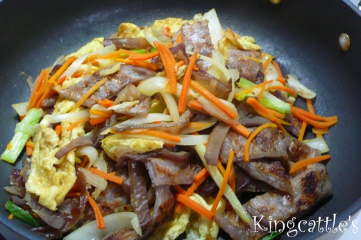 3、利用煎蛋剩下的少許油炒香蒜末並將洋蔥絲、紅蘿蔔絲炒軟,放入黑木耳絲、青蔥段、蛋皮絲並調味,最後起鍋前放入蔥油餅稍微拌炒就可起鍋了。