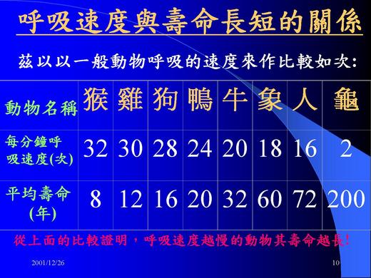 從上表看,可知呼吸速度越快者其壽命越短.如猴子每分鐘呼吸速度