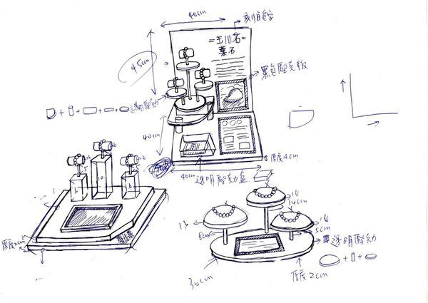 為求質感,原玉川石與現場櫃位擺設部分均為護貝紙,後來修正為用相框方式呈現,列印紙張材質用珍珠板材質列印。