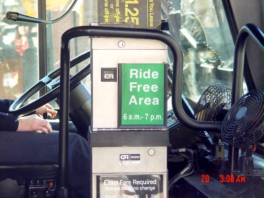 公車免費搭乘的時間範圍是早上6時到晚上7時之間。可以免費搭乘的公車,在車站掛有綠色免費搭乘的標誌(ride free area),而車上的收票口也有一個相同的標誌。除這以外的時間及以外的區域,每趟收費1.25元,車輛一旦超出免費搭乘的範圍,停車後,在第一位乘客上車之前,司機會把綠色免費搭乘的標誌取下,換上1.25元的標誌。