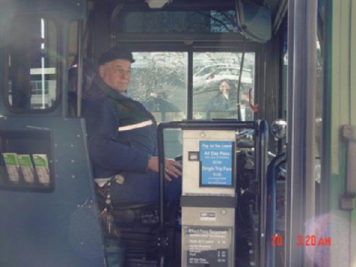 圖上:這位白人公車司機已經要關門了,看見筆者照相,又把門打開。請注意車內的訊息:藍色的收費牌上有單程票價1.25元(下),一日周遊券是2.5元(上),駕駛座的外側,靠近走道的位置放著公車路線及時刻表,讓乘客自由取用。