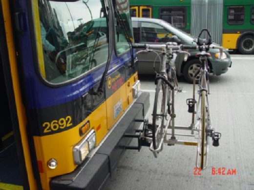 圖中:西雅圖公車車頭前方都豎著一個金屬架子,那是專門方便讓騎腳踏車的人搭乘公車時放置腳踏車用的,平常不用時金屬架子是豎立緊靠著車頭,當騎腳踏車著要搭乘公車時,就把架子拉平,可以架兩輛腳踏車在上面,兩輛腳踏車必須錯開放置,架子上有固定用的拉桿,可以壓住腳踏車的前輪(因為腳踏車龍頭是活動的)。