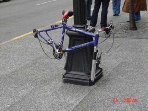 圖下:在西雅圖騎腳踏車的人極多,這邊騎腳踏車的人裝備大都很齊全,不知道是否像我們規定騎機車一定要戴安全帽一樣,規定騎腳踏車的人一定要戴安全帽?路上也到處看得到停放的腳踏車,這邊的人都用很好的鎖鎖住腳踏車,但是仍然有被偷零件的情形,可見全天下的人性都是一樣的。雖然用很好的鎖鎖住腳踏車,但是仍然有被偷零件的風險。
