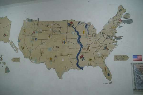 這幅位於營區中山室(餐廳兼休閒室)正面牆壁的美國地圖,圖幅寛約4.8公尺,高約1.9公尺。圖中描繪美國大陸東岸距離馬祖1萬3000英哩,西岸距離馬祖約8100英哩。 觀察此圖,可以看出各州繪製著具有民俗特色、產業發展、人文地理及當時美軍駐地、軍種記號等圖案。其中北美洲中部平原為世界著名農業區,以農夫圖案代表當地茂盛的農業發展;東北岸為世界著名的漁場,海岸外盛產龍蝦、漁產等,以龍蝦圖示代表;夏威夷州以觀光業著名,以夏威夷草裙女郎為特色圖案,代表當地美麗的熱帶風光。