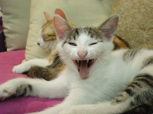 看了一個小時,我又進去房間看一下牠們一家三口,嚇~~!!!!!怎麼一個小時就變一家四口了!!!產房裡面又躺了另一隻小貓咪,而我的床上則是滴滿了血跡......天啊....竟然在我床上生~~MIUMIU跑來跟我撒嬌,我立刻拿了罐頭給牠吃,慰勞他一下,阿尼隨即就表演起不可能的任務---阿湯哥的絕技,趴在高處半個身體都跑出來由上而下伸出長手撈撈撈,想要搶我手上的罐頭,我不給牠吃牠就跑去跟牠媽咪搶,但是又搶不過他媽咪只好跑去打弟妹的頭出氣,整各晚上MIUMIU都一直叫阿尼進去照顧小貓咪,她自己則在外面閒逛吹冷氣,除非餵奶否則牠才不想進去產房,而阿尼則是被牠媽咪逼迫要守在產房附近,照顧大家的安全,如果阿尼不想去,她媽咪就會一直碎碎唸,罵牠一整晚.......結果就是我們整個晚上都被這一家子吵得沒睡,最後阿尼才乖乖地躺在媽咪和弟妹產房門口,當起了保家衛國的小王子~!