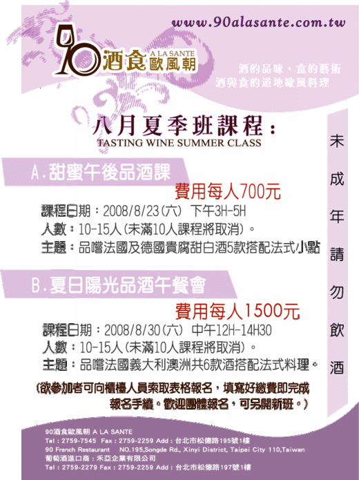 品酒會八月份報名表來了~~各種不同的酒款搭配每次都不同的法式料理,比任何一個品酒課還要超值!!動作要快喔,報名額滿就要再等一個月~~![]()