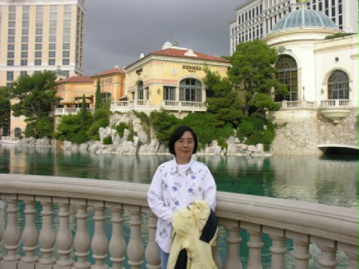 此時的賭城,已卸下了夜間的濃妝,不再夢幻奇麗﹐卻是清新俊秀。夜裡難得地下了些雨,空氣裡有潮濕的味道,令秋天瀰漫著春意。行人不多,汽車也少,一個寧靜的早晨。Bellagio酒店在右手邊與我們隔湖相望,『埃菲爾鐵塔』靜靜地聳立在街道對面,一個中年白人女子踏著輕快而有節奏的步調正進行她的晨練。好似一幅水彩﹐這一汪湖水的湛藍,半圍石欄的淺灰,幾處建築的米黃和雪白,還有樹叢的青綠,再添上樹叢中小樓的紅頂,於是淡雅而不冷淡,更顯出典雅的韻味。目光徜徉之際,不禁心中自問,這是荒涼沙漠環抱的拉斯維加斯嗎?這是燈紅酒綠的賭城嗎?
