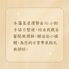 運勢:今天內心會有些掙扎,但這是你轉化能量的好時機。當你願意誠實面對,就離突破不遠了。