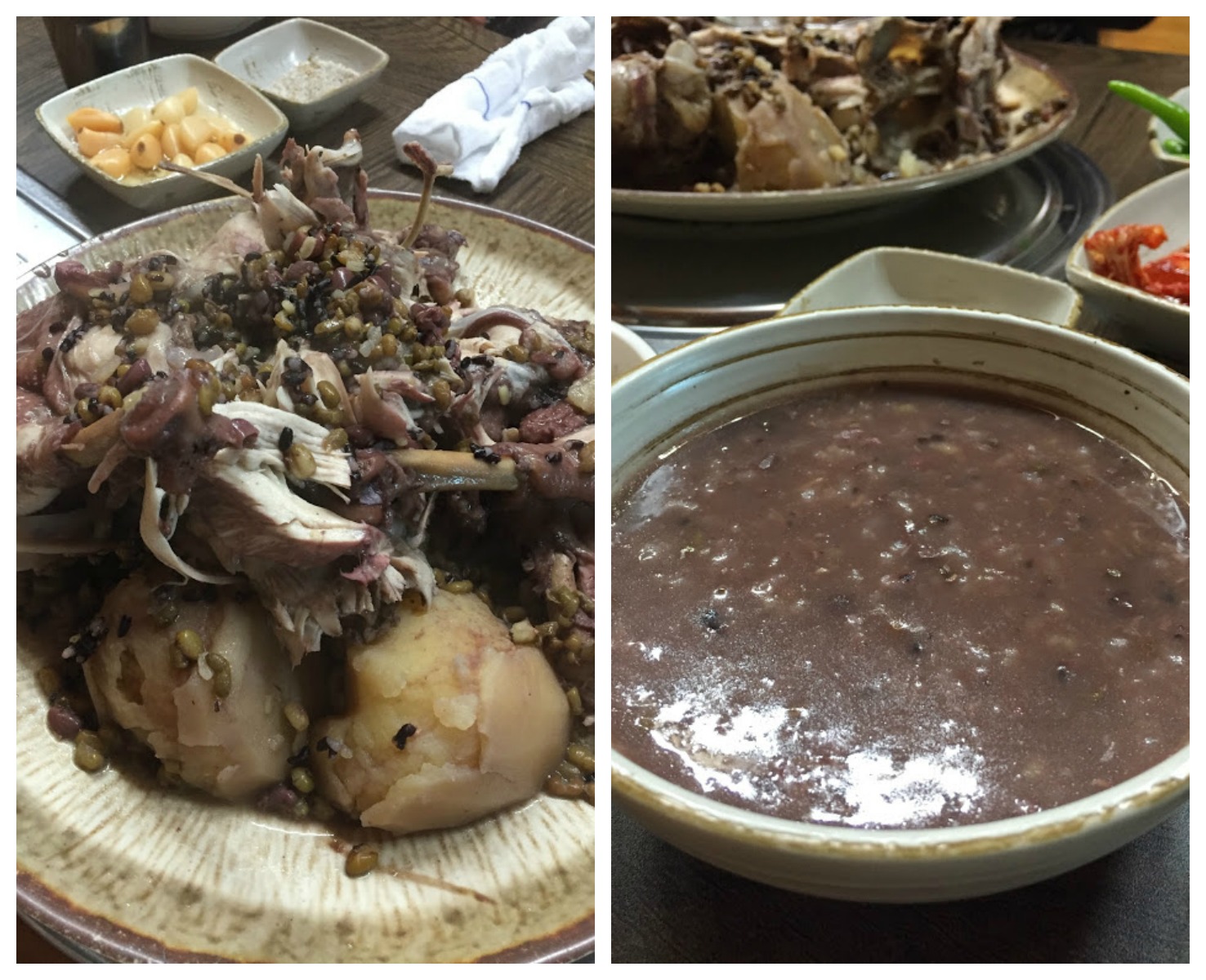 第一天吃燉雞,將土雞、薯仔、紅豆、綠豆等燉成粥,上桌時就是兩隻燉雞,配以一碗韓式燉粥,以豆為主,跟我們吃慣的米粥不同。土雞點海鹽吃起來很滋味。