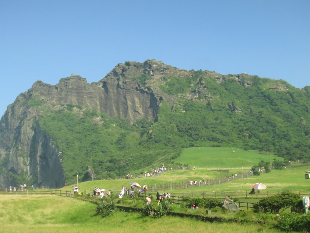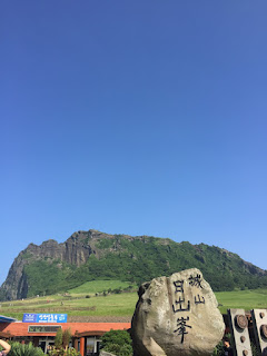 最後去了城山日出峰,是一高聳的巨岩。這是濟州著名的世遺景點,但我們一家大小沒有爬山,在山下拍張照片到此一遊就算。