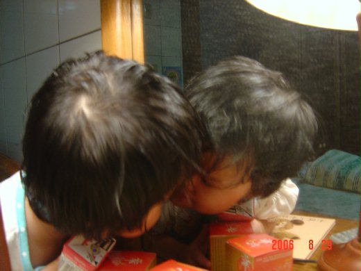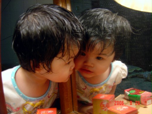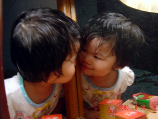 幸恩覺得照鏡子很好玩,她會像個大近視眼似的,把臉往鏡子貼得很近很近。看著小小幸恩的一舉一動,真是有趣!有時候會期待幸恩快快長大,陪媽咪遊山玩水去;有時候又希望幸恩就這樣永遠是個可愛的小小孩,別那麼急著長大,硬是把媽咪給追老了。