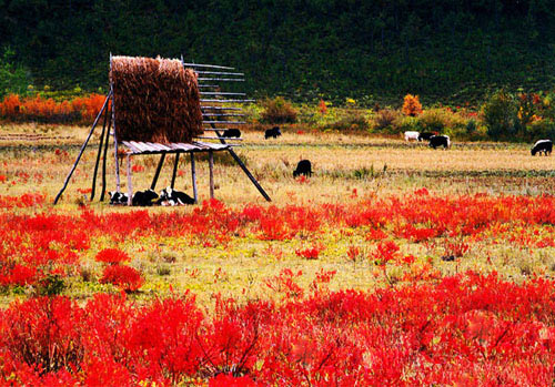 春天香格里拉一望無際的大草原上,狼毒開著黃色的小花,一叢叢散落著,宛若一幅淺淺的浮雕畫。到了秋天,整株植物就變成紅色,像火焰一樣燒遍了草原。