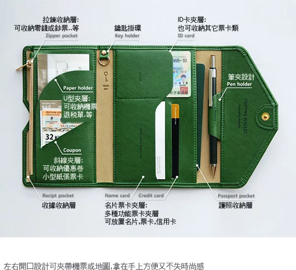 ●筆插/票卡夾/鑰匙圈/護照,機票夾層/零錢鈔票,內部多元收納。