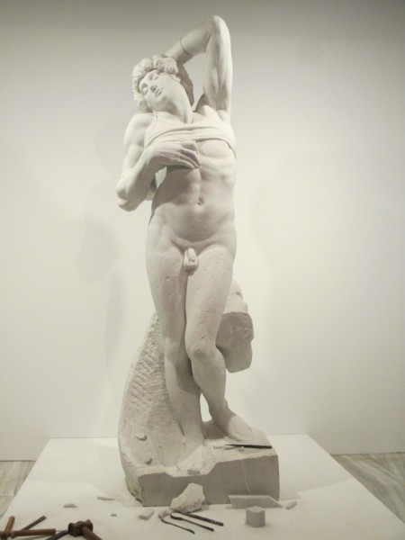 *<奴隸>,其實是指不自由的人,被束縛的人,旁有猴子當柱台,猴子愛模仿,手被綁著,喻指文化、藝術創作走下坡。要繞著360度看。