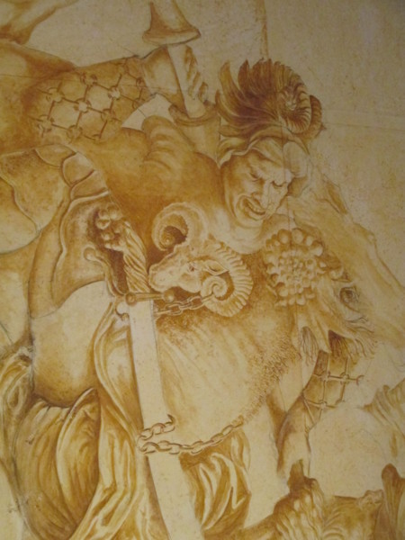 *希臘像是銅鑄,羅馬用大理石,大理石亦傾倒,所以多了柱台,美化柱台,米開朗基羅雕柱台以故事性人物串連。人羊獸。