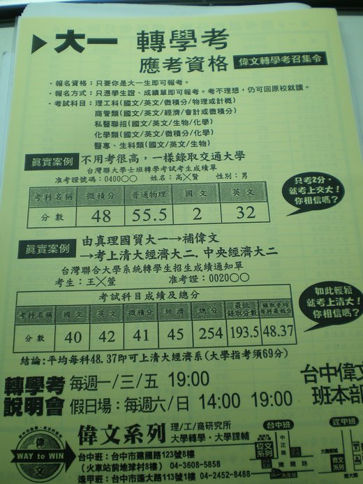 我無聊去驗證廣告上附的兩個「真實案例」,不知道他們是哪一年考的,我查了96及97的榜單,找不到類似高X賢及王X萱的名字,96年還沒開放中央經濟大二轉學考。