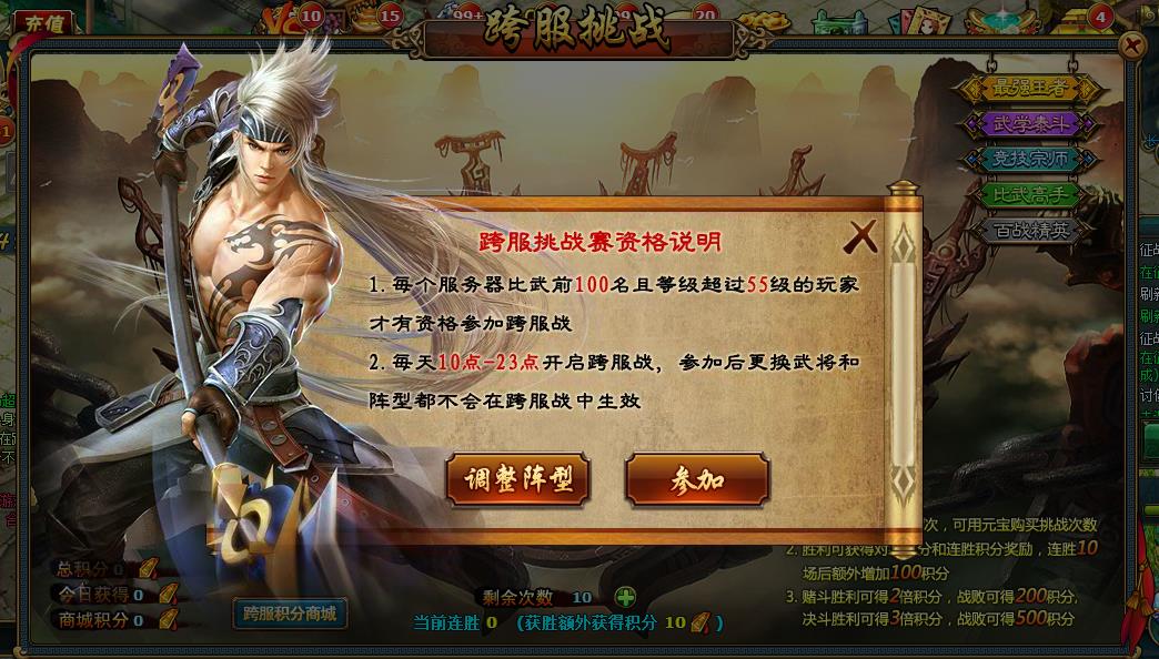 全民競技,火爆來襲,10/23將開放公測全新玩法--「跨服挑戰」,強者與強者之間的對決,唯有強化自身的戰力才能接受八方挑戰,玩家必須達成特定等級及條件,並根據麾下英豪之專屬特性,排列出最強陣行以迎戰強敵,唯有一路擊敗敵手獲取最後勝利,才有資格擁有獨特稱號及珍稀寶物。三國英豪,問鼎巔峰,熱血沸騰,不服來戰!