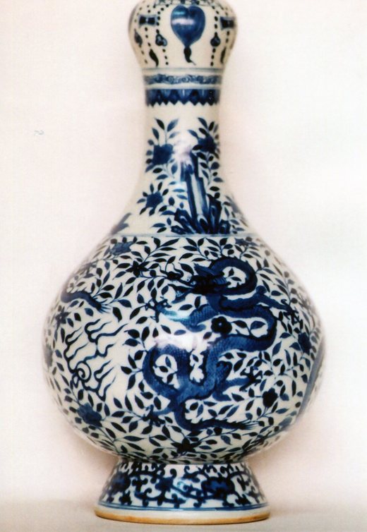 大明萬曆年製青花穿花龍戲珠紋蒜頭高足玉壺春瓶