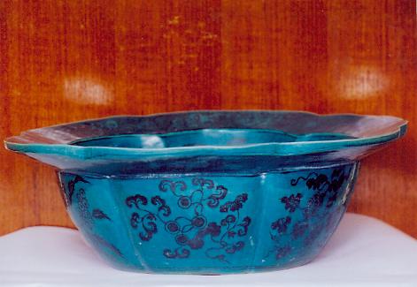 大明宣德年製孔雀藍青花花果紋花朵洗