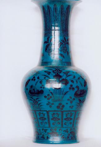 大明宣德年製孔雀藍青花荷塘鴛鴦紋廣口長頸瓶