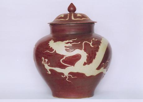 紅地刻劃白磐龍紋珠鈕蓋罐