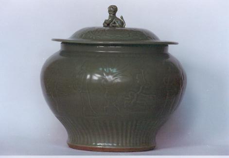 龍泉青瓷庭園人物紋獅鈕蓋罐