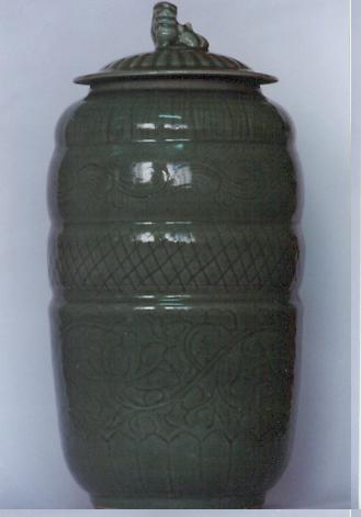 龍泉青瓷纏枝花紋四重獅鈕蓋罐