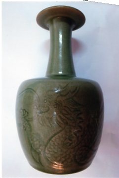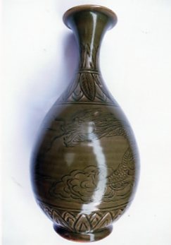 一只五芝麻釘崇寧元年款豆青冰裂刻印龍戲珠紋紙搥瓶開啟宋官汝窯的面紗按崇寧為北宋微宗年號元年為西元1102年若以此瓶為標準瓷則北宋微宗官汝窯陶瓷已經出現其特徵釉為冰釉年代久遠已產生釉裂如皮膚紋般可見胎底有橘皮紋目前釉色為豆青粉青胎為紫胎有紫口紫足特徵紋飾工藝為素紋與暗花有龍戲珠紋朵花紋花瓣紋器形有花朵碗三足陰弦紋圓洗紙搥瓶等並查相關資料此瓷為汝州文廟新窑器此瓶與耀州青瓷老龍行雲紋玉壺春瓶龍紋及釉色相比對相似度也有八十百分比因此汝州新窯器的窯工可能有來自耀州窯工之可能性