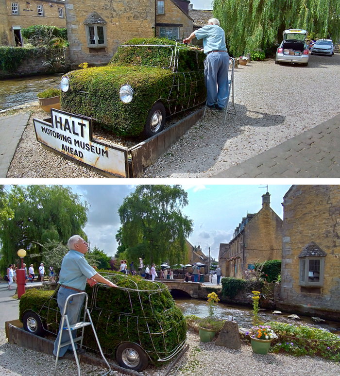 老先生正在修剪汽車博物館的門面樹型。