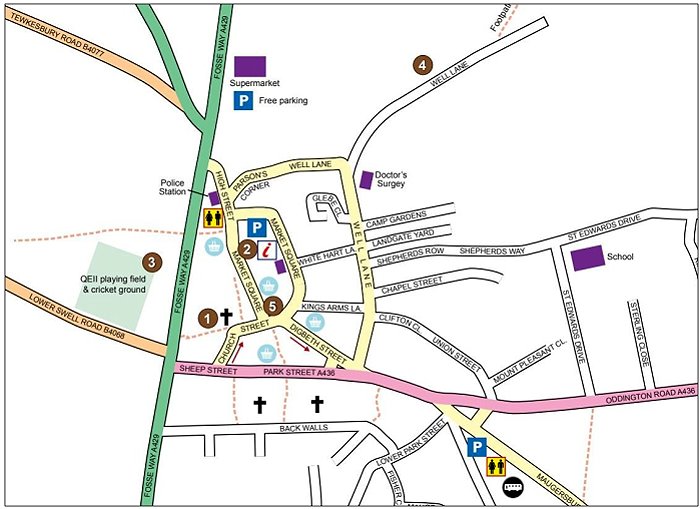 Stow-on-the-Wold城鎮地圖(圖引https://reurl.cc/SotW24 可點看大圖)。當時擔心鎮上不好停車,就直接停在鎮外主幹道羅馬福斯路(Roman Fosse Way)的免費停車場,再走進鎮上中心區。