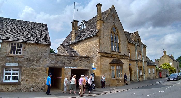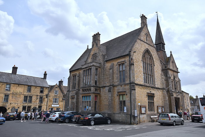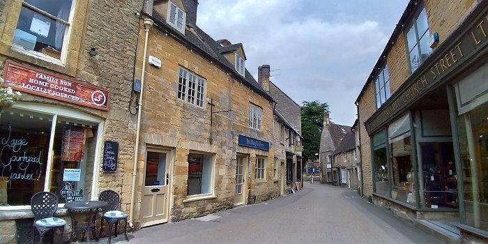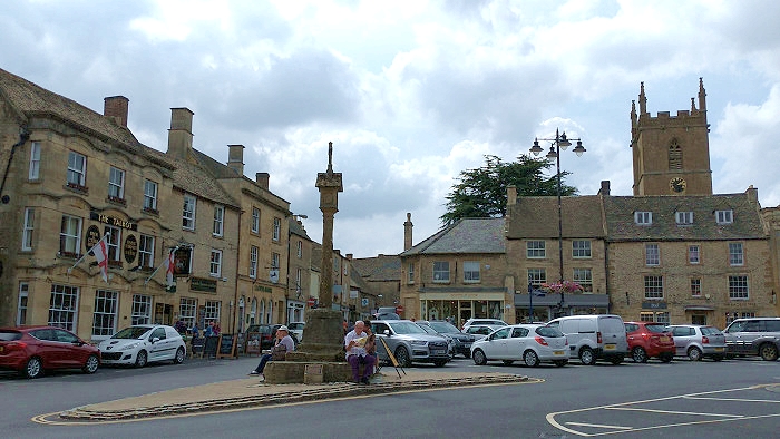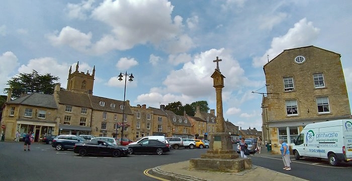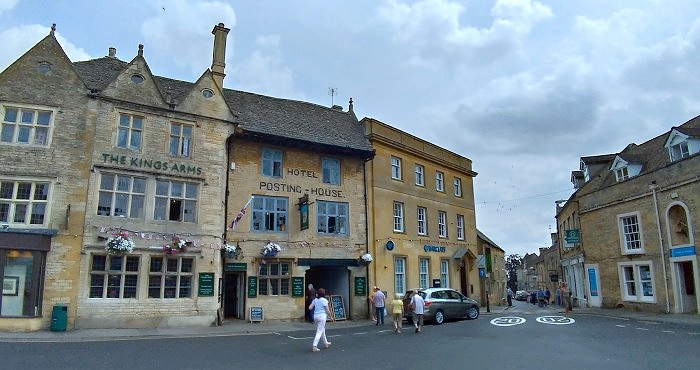 集市廣場周圍大部分建築為18 至 19 世紀以蜂蜜色科茲窩石所建,現多數經營古董店、餐館、傳統酒吧和旅店。↑圖左棟有三角山牆的建築「the Kings Arms」在1645 年曾接待了查理一世國王。
