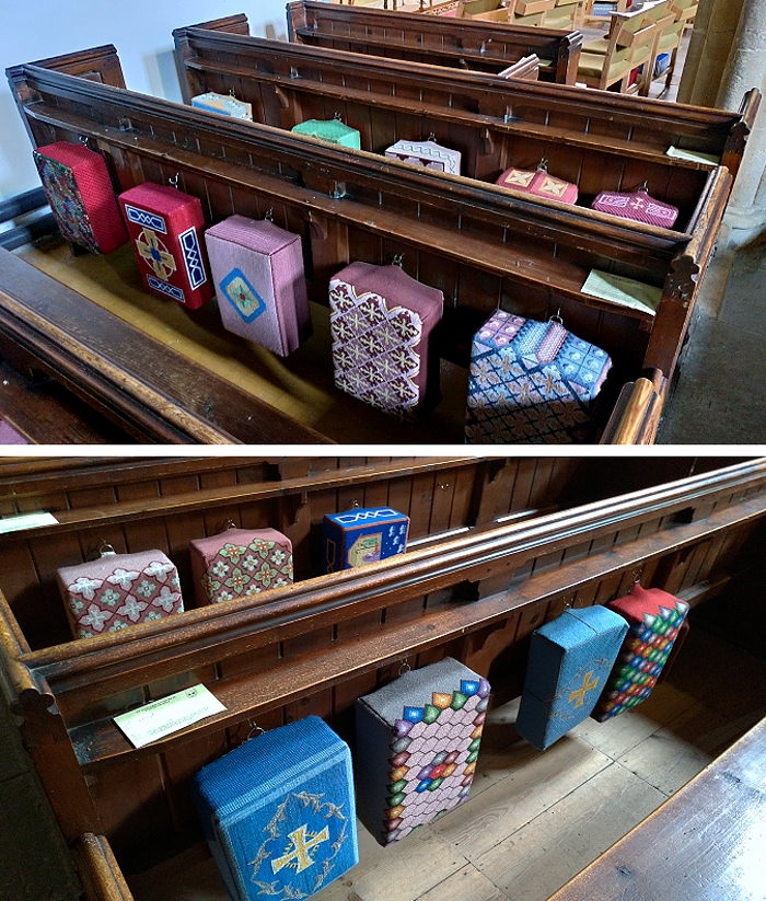 座椅前方掛有圖案各異、五彩繽紛的方枕,推測是跪墊之用,相當別緻。
