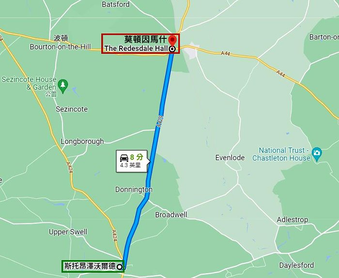 直接導航到莫頓因馬什位於主幹道羅馬福斯路(Roman Fosse Way)的雷德斯代爾大廳(Redesdale Hall),這裡是小鎮的重心地帶,巴士站、火車站都在附近,一旁就是停車場。