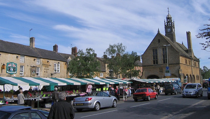Moreton-in-Marsh 於 1227 年獲得市場特許權,著名的市場至今仍然於全年每週二舉行。週二市場就設在雷德斯代爾大廳(Redesdale Hall)二側停車場延伸,約有 200 個攤位,是全科茲窩地區規模最大的露天市場,吸引了許多遊客前來(圖引https://reurl.cc/MtiM21)。